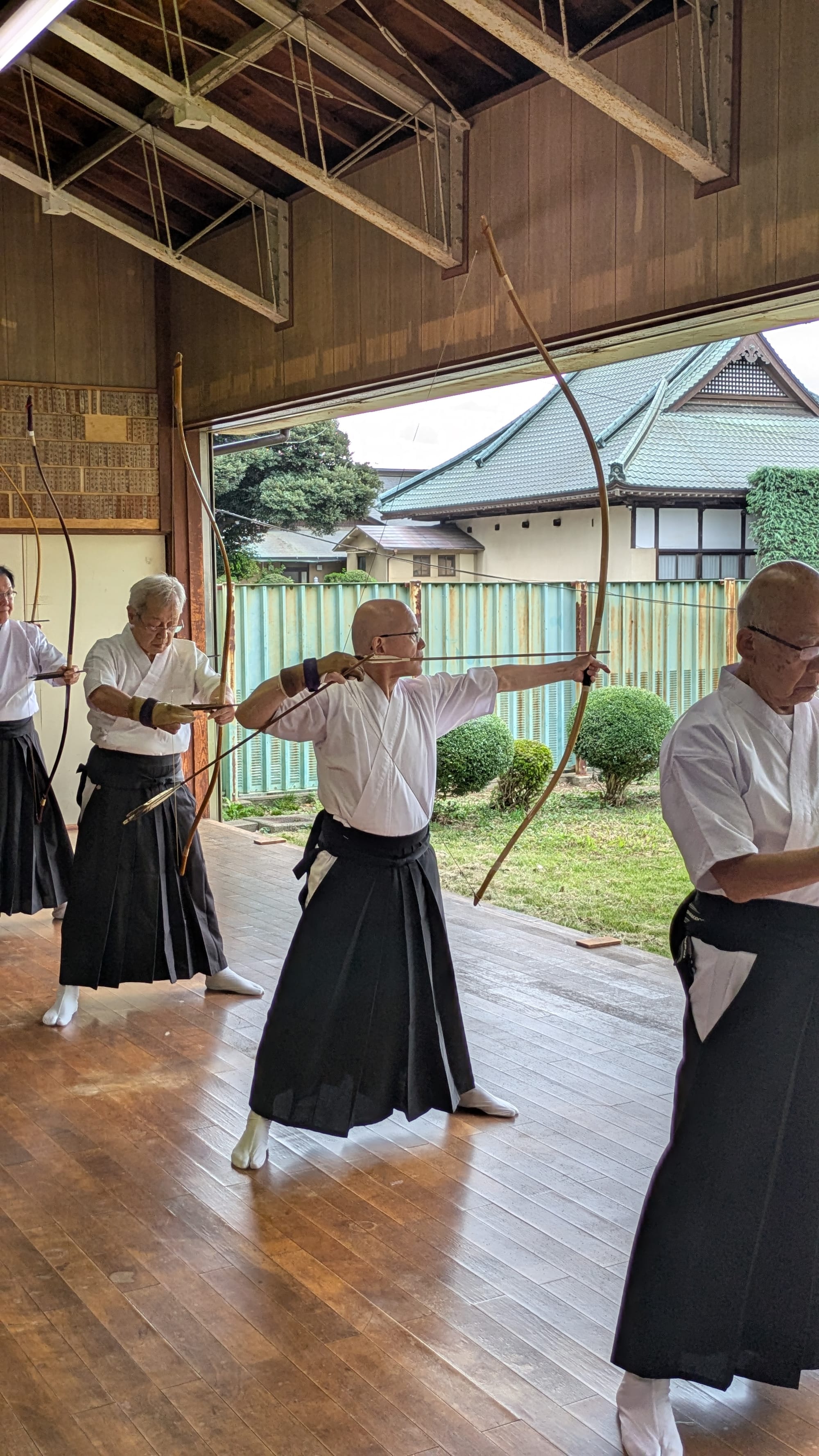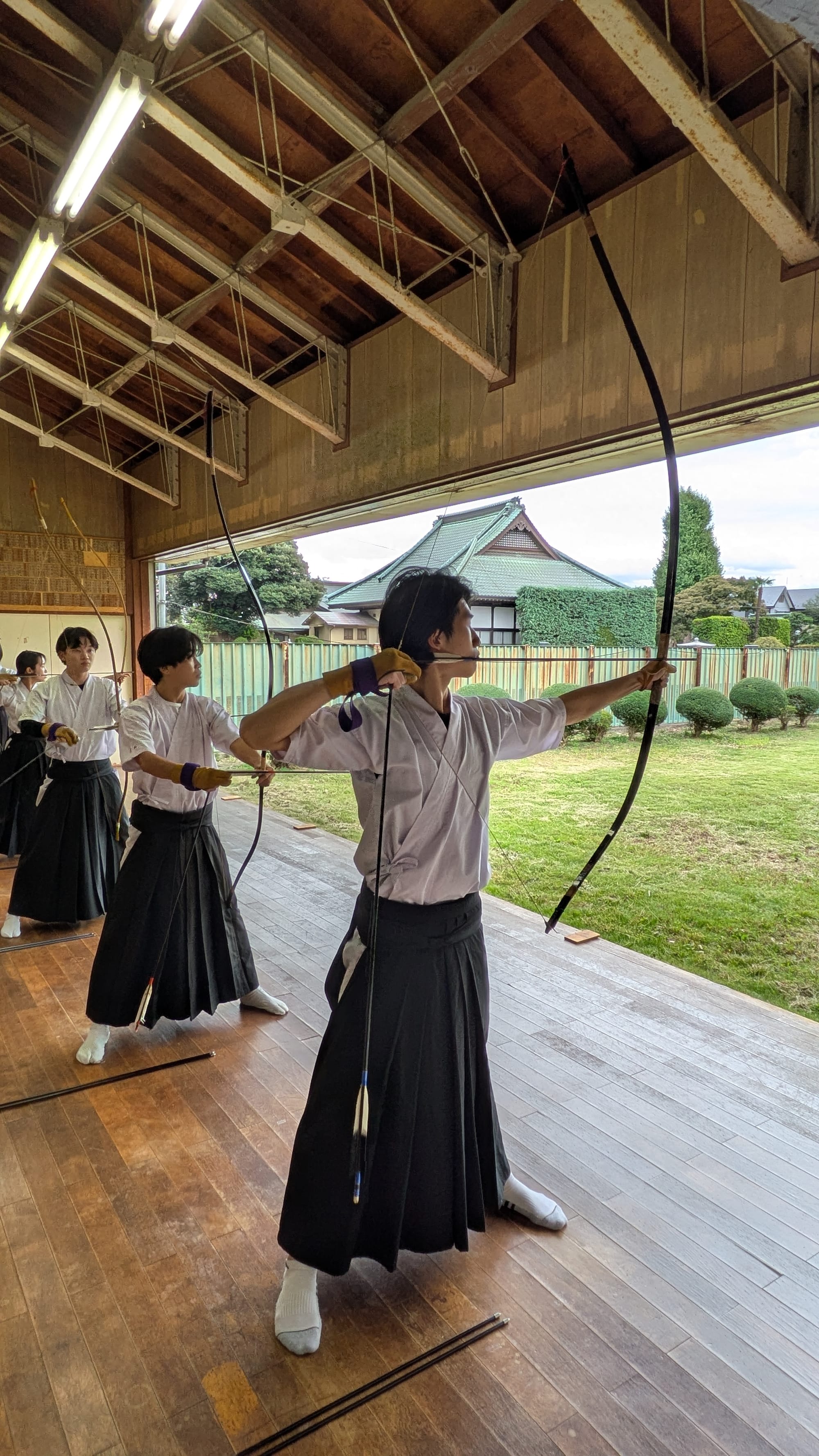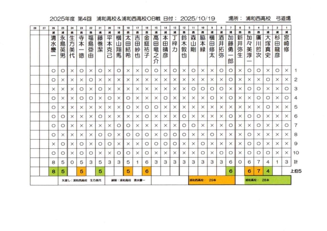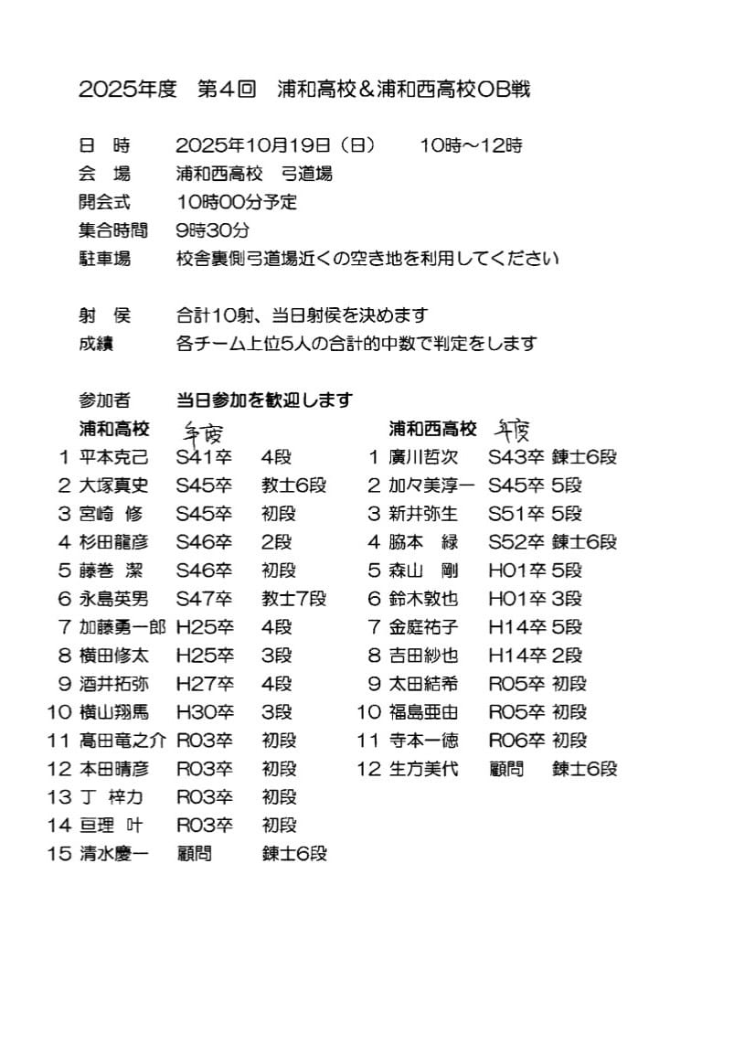 2025年10/19(日)西高戦 22期・宮崎さん23期・杉田さん22期・大塚さん65期・加藤さん67期・酒井さん65期・横田さん73期・丁さん73期・本田さん73期・髙田さん70期・横山さん18期・平本さん23期・藤巻さん24期・永島さん浦高弓道部顧問・清水先生納射(清水先生)閉会式優勝・浦和西高校的中結果懇親会